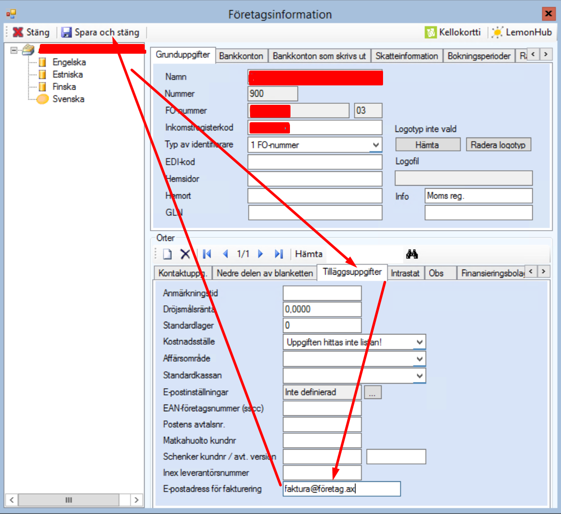 För att skicka ut epost-fakturor med en gemensam adress vid sändning från Fakturornas sändningscentral behöver epost-adressen fyllas i under Inställningar→ Företagsuppgifter→Tilläggsuppgifter→ E-postadress för fakturering.